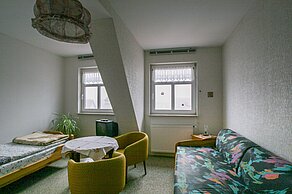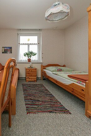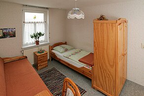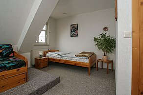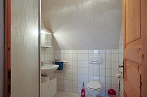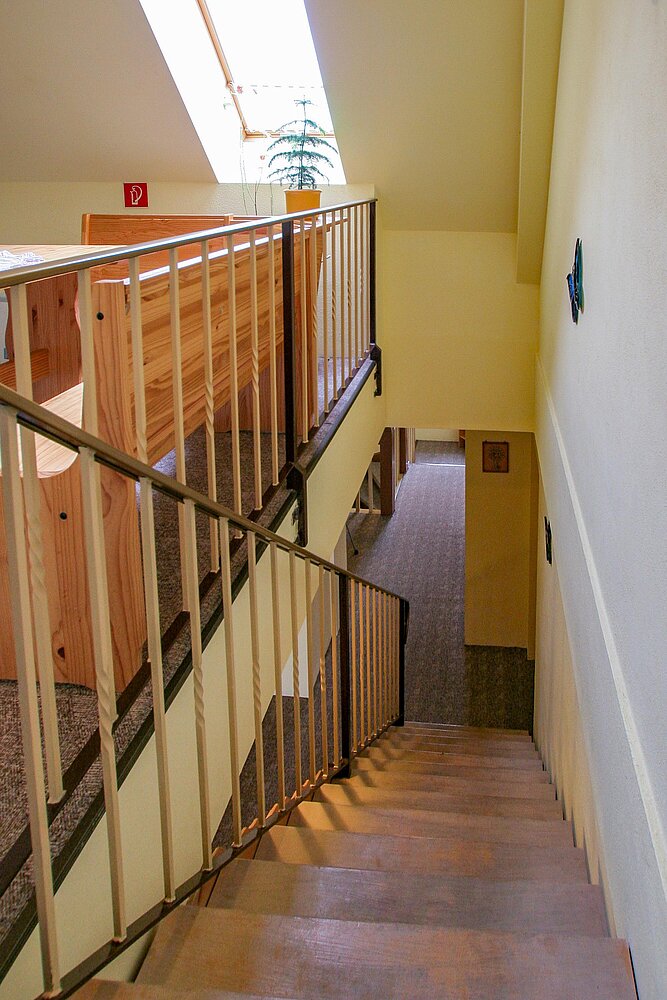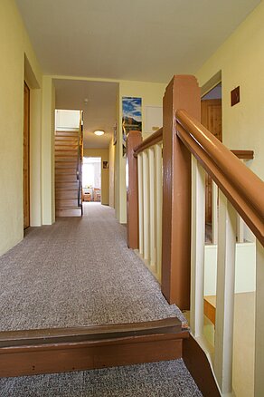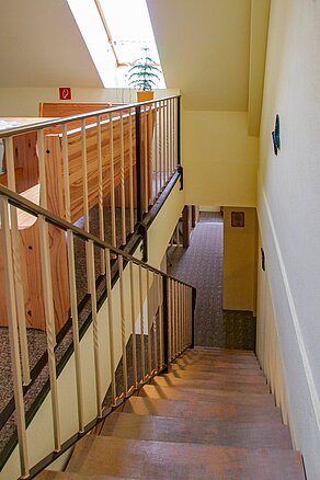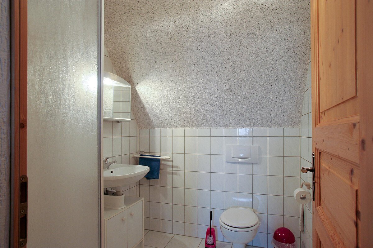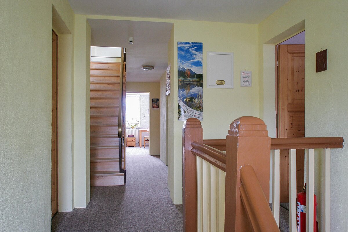 6 Zimmer verfügen über ein eigenes Bad, die übrigen teilen sich separate WC- und Duschbereiche. Im Erdgeschoss befinden sich der Frühstücks-/Gemeinschaftsraum, eine Küche, zwei Gästezimmer mit Bad sowie ein Büro. Weitere Zimmer liegen im Ober- und Dachgeschoss. Teilunterkellert, Ölzentralheizung (Bj. 1997).